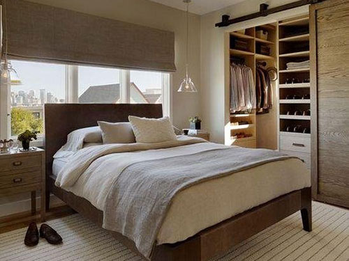 假如臥室戶型比較方正或為細(xì)長型的,可直接按照自己的需求與實際情況在臥室專門劃一片空間規(guī)劃為步入式衣帽間,施工量不大,寬廣且空氣流通好。